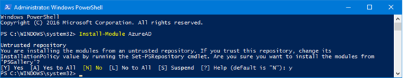 Start a PowerShell command prompt with administrative permissions and execute following command the command to install the AzureAD PowerShell module, if you haven’t already done so. If any questions are raised whether you want to install this module from an untrusted source, type: