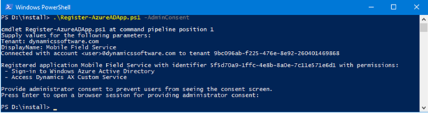 Start a PowerShell command prompt and execute PowerShell script Register-AzureADApp.ps1 with the arguments specified below. The script will ask for the Azure AD tenant for installation and the name of the application.