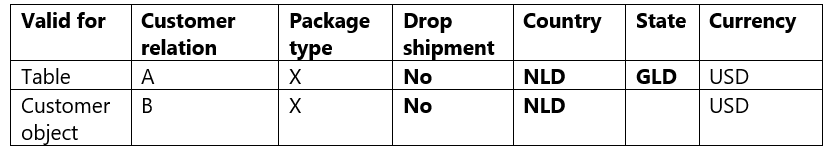 Based on this setup, the first line will be applied as Order cost, even though Customer object is higher in the sequence. This because it is more specific, it has a match with the State.